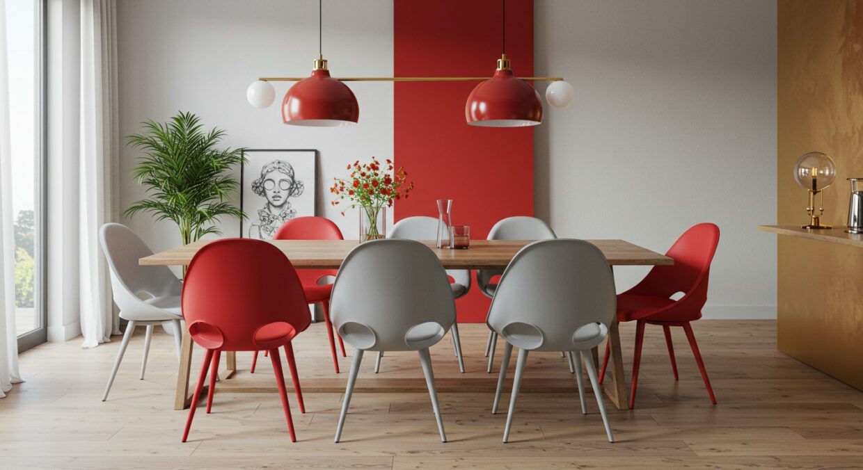 - Style scandinave : Associez des chaises Eames blanches et grises avec une chaise Panton rouge pour un accent audacieux.