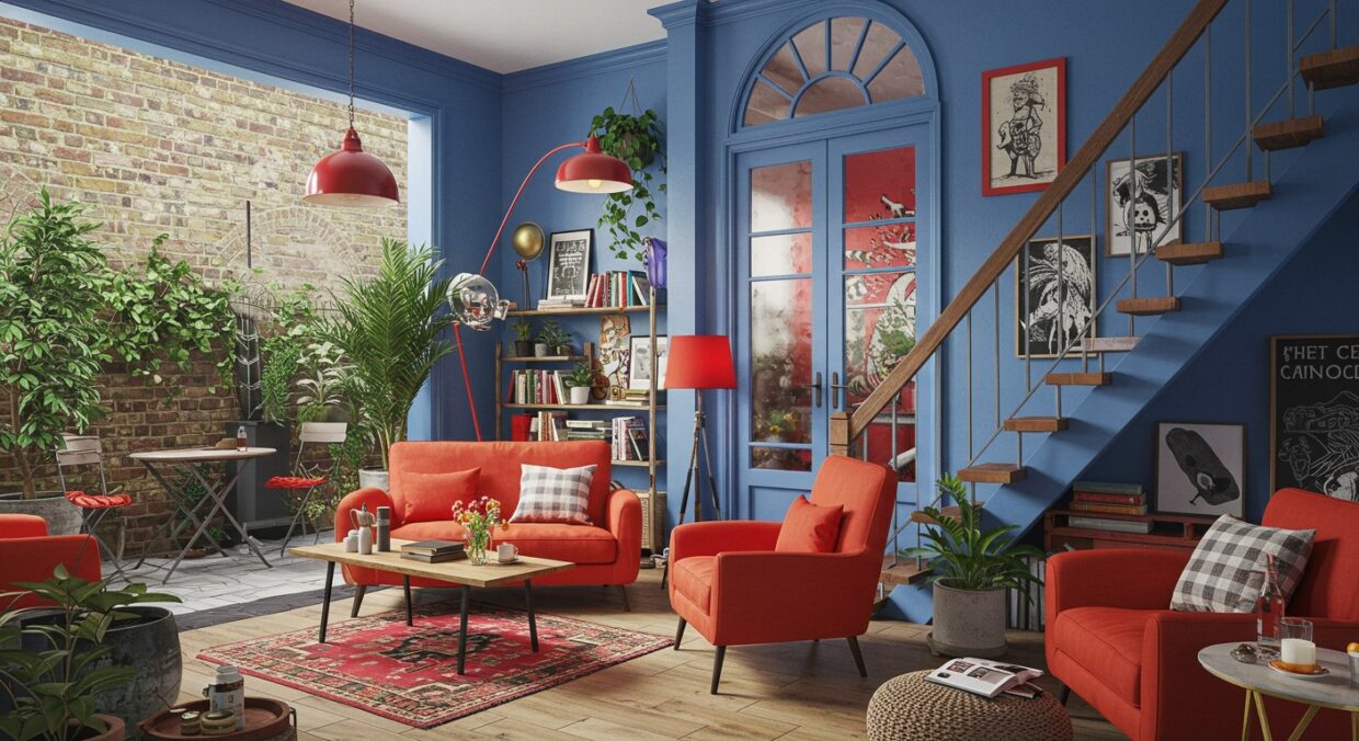 Le style éclectique, comme celui de cette maison, permet de mélanger les genres sans crainte. Il combine des éléments industriels, bohèmes et modernes pour créer un espace unique. L’astuce est de maintenir une cohérence, ici assurée par la palette bleue et des touches contrastantes comme le rouge ou le noir.