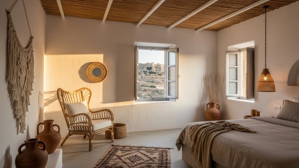 Parmi mes coups de cœur : des coussins imprimés avec de jolis motifs traditionnels que j’ai trouvés il y a deux ans et que je garde précieusement. Ils apportent une touche graphique sans être trop chargés. J’ai également ajouté des housses en velours vert avec un motif en croix contrastant et quelques coussins en tissu teddy bear marron, très doux au toucher même s’ils sont un peu fins.