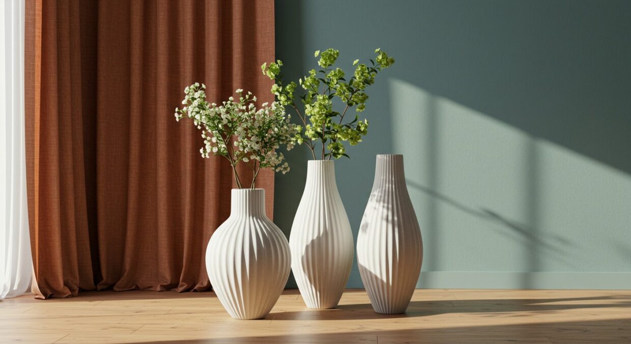 Dans un salon, pensez à une table basse ou une étagère. Un vase unique peut suffire sur une table basse, surtout s’il est agrémenté d’herbe de pampas ou de fleurs séchées. Sur une étagère, regroupez les trois vases pour un effet de collection, en alternant avec des livres ou des objets décoratifs. Évitez les espaces trop encombrés : le minimalisme nordique repose sur la respiration visuelle.
