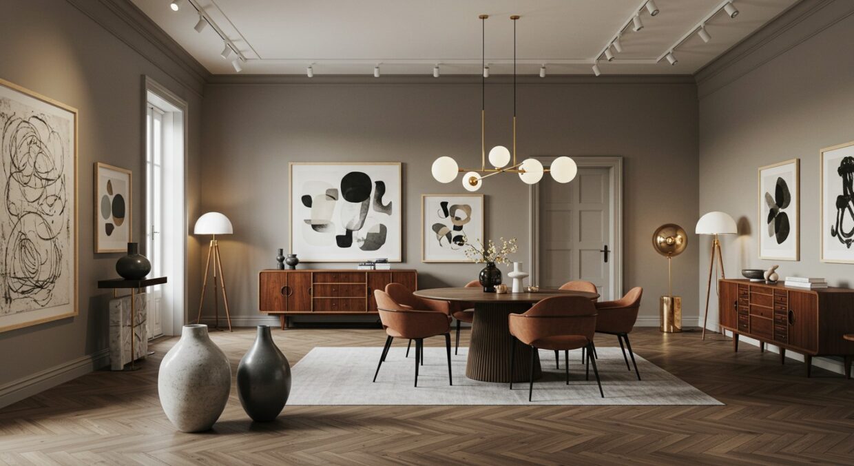 Pour intégrer cette tendance chez vous, misez sur des pièces statement. Une lampe en céramique aux formes sculpturales, un tapis graphique ou une chaise aux lignes rétro peuvent suffire à transformer une pièce. L’astuce est de ne pas surcharger : quelques éléments forts suffisent pour donner du caractère sans tomber dans l’excès.