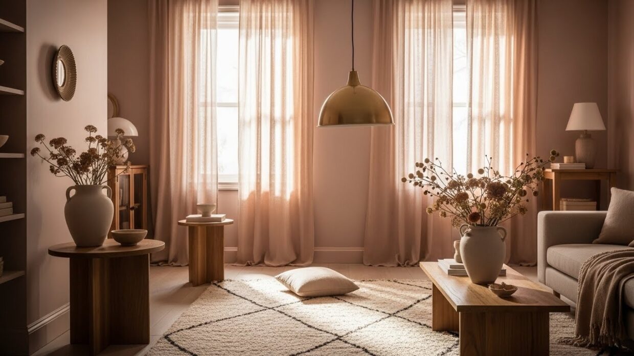 Autre astuce qui change tout : associer ce beige rosé à des matériaux bruts. Le bois de frêne clair, le travertin, la céramique mate ou le cuivre patiné créent immédiatement du contraste et de la personnalité. C’est la différence entre une déco « jolie » et une déco qui a une âme.
