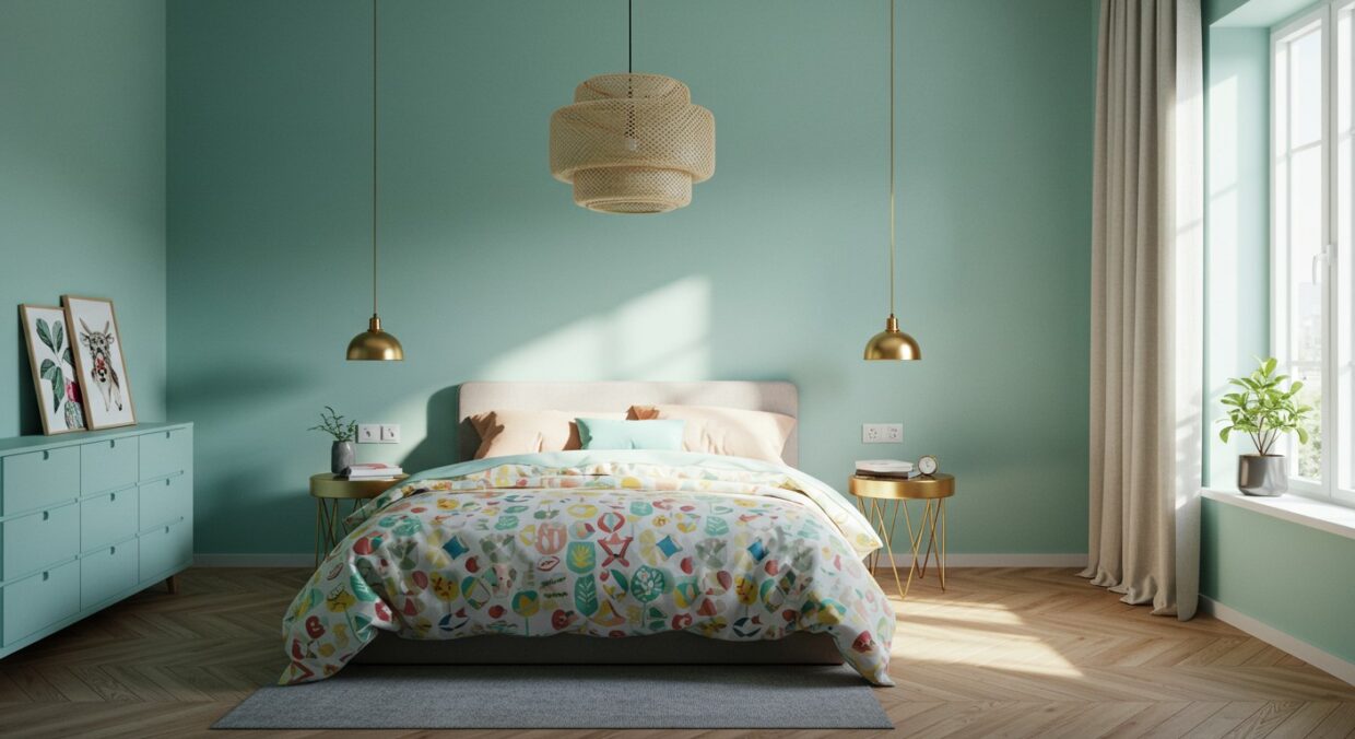 Imaginez une chambre avec des murs bleu canard, un lit en bois clair, des rideaux corail et des touches dorées dans les luminaires. Ajoutez un tapis à motifs géométriques pour un style moderne et chaleureux.