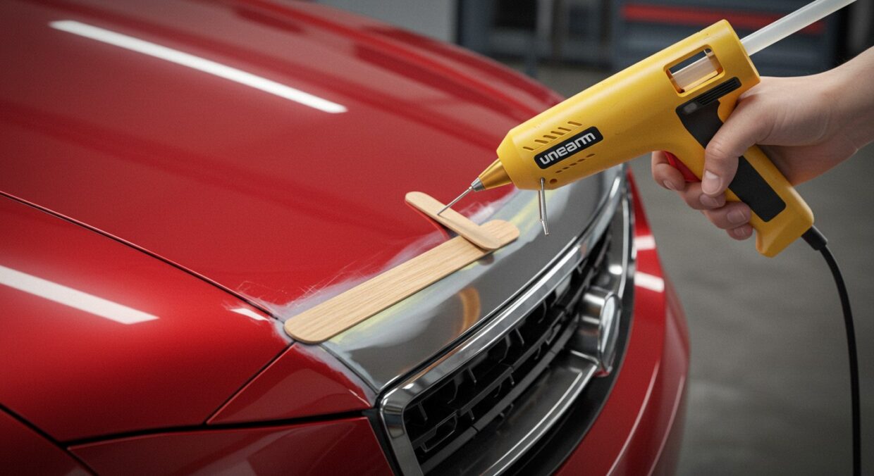 Vous rentrez chez vous après une longue journée, et là, horreur : une bosse disgracieuse orne le capot de votre voiture. Un caddie mal garé, une branche tombée ou une portière voisine un peu trop enthousiaste… peu importe la cause, le résultat est le même. Vous pensez immédiatement à la facture salée d’un garagiste, mais et si une solution simple, économique et à portée de main existait ? Dans cet article, nous allons explorer une astuce surprenante qui utilise un outil inattendu : le pistolet à colle chaude. Oui, cet outil que vous utilisez pour vos projets de bricolage peut aussi redonner une seconde jeunesse à votre carrosserie !