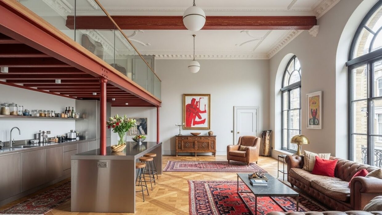 Vous est-il déjà arrivé de tomber en arrêt devant une annonce immobilière et de vous dire « là, je signe tout de suite » ? C’est exactement ce qui m’est arrivé en découvrant ce duplex niché dans une ancienne salle de bal à Kensington, Londres. Quatre mètres de hauteur sous plafond, un parquet Versailles récupéré, des poutres rouges spectaculaires… Tout y est.
